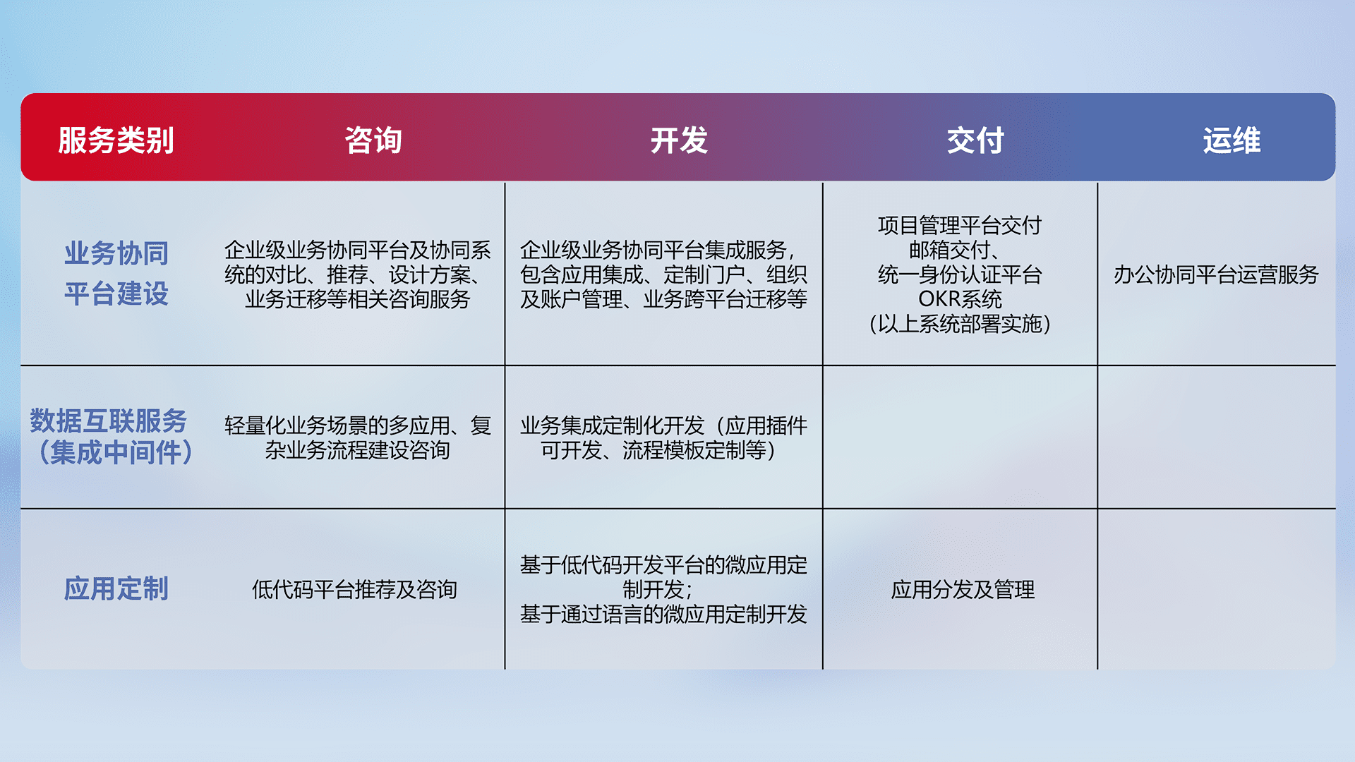 针对钉钉、、、企微、、IDaas等平台级产品提供产品的规划、、、、方案、、、交付、、、、定制化开发等服务,,,实现如统一协同办公、、、、智能客户服务、、、、混合会议管理、、智能数据查询、、、等业务场景,,,,实现数字化转型。。